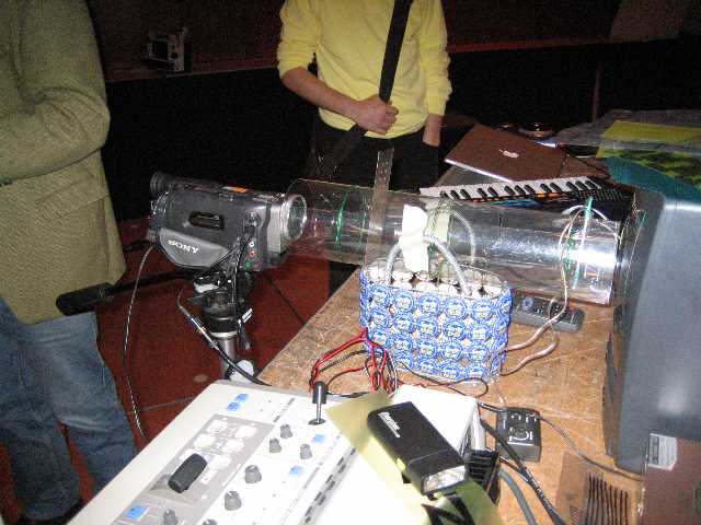 Werner Moebius works simultaneously on a digital and analog level. That means real-time composition oscillating between conceptual sound work and improvisation with the spatial specifics. From digital equipment he plays loops and samples, which are influenced by various filters by duration of time. At the same time, he uses a prepared plastic tube as an acoustic interface for catching arising sound architectures on the analog level. A microphone inside the tube and special devices serve for generating monochrome sound escapades and bizarre feedback loops which return to the space. Billy Roisz works at the same time with the analog arising audio feedbacks. She uses a video mixer, camcorder and TV screen on a visual level and produces optical loops in a semi-digital context. The acoustic feedback circulations are manipulated by editing tools of the video mixer and through movements of the camcorder which is permanently focusing on the screen. The outcomes are bizarre imploding visual loops. Billy Roisz specializes in feedback video and video/sound interaction using monitors, cameras, video mixingdesks, a selfbuilt videosynth, computer and turntables for video and sound generating.